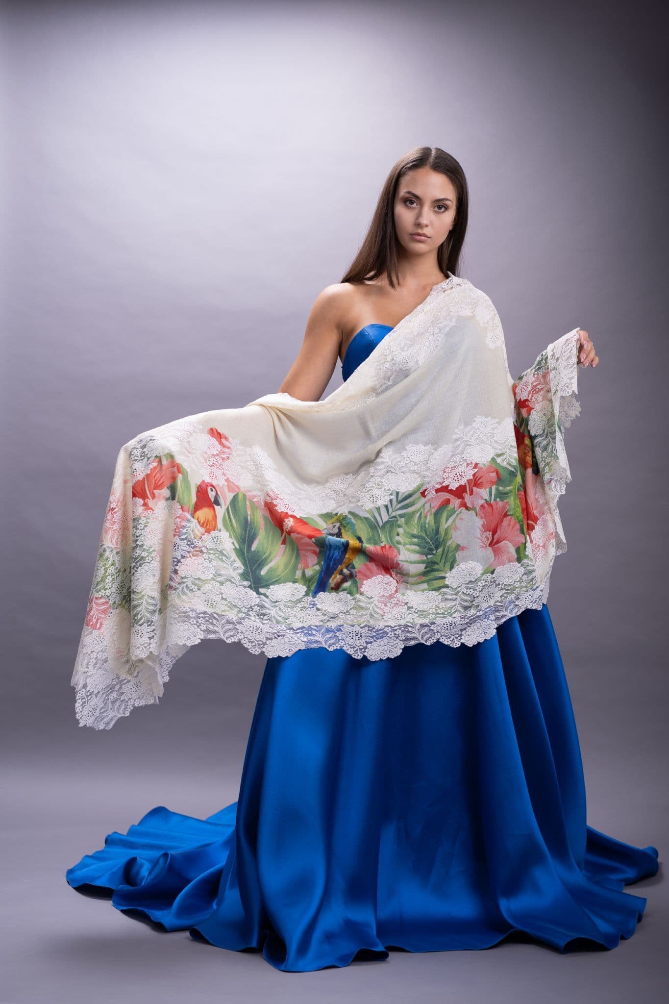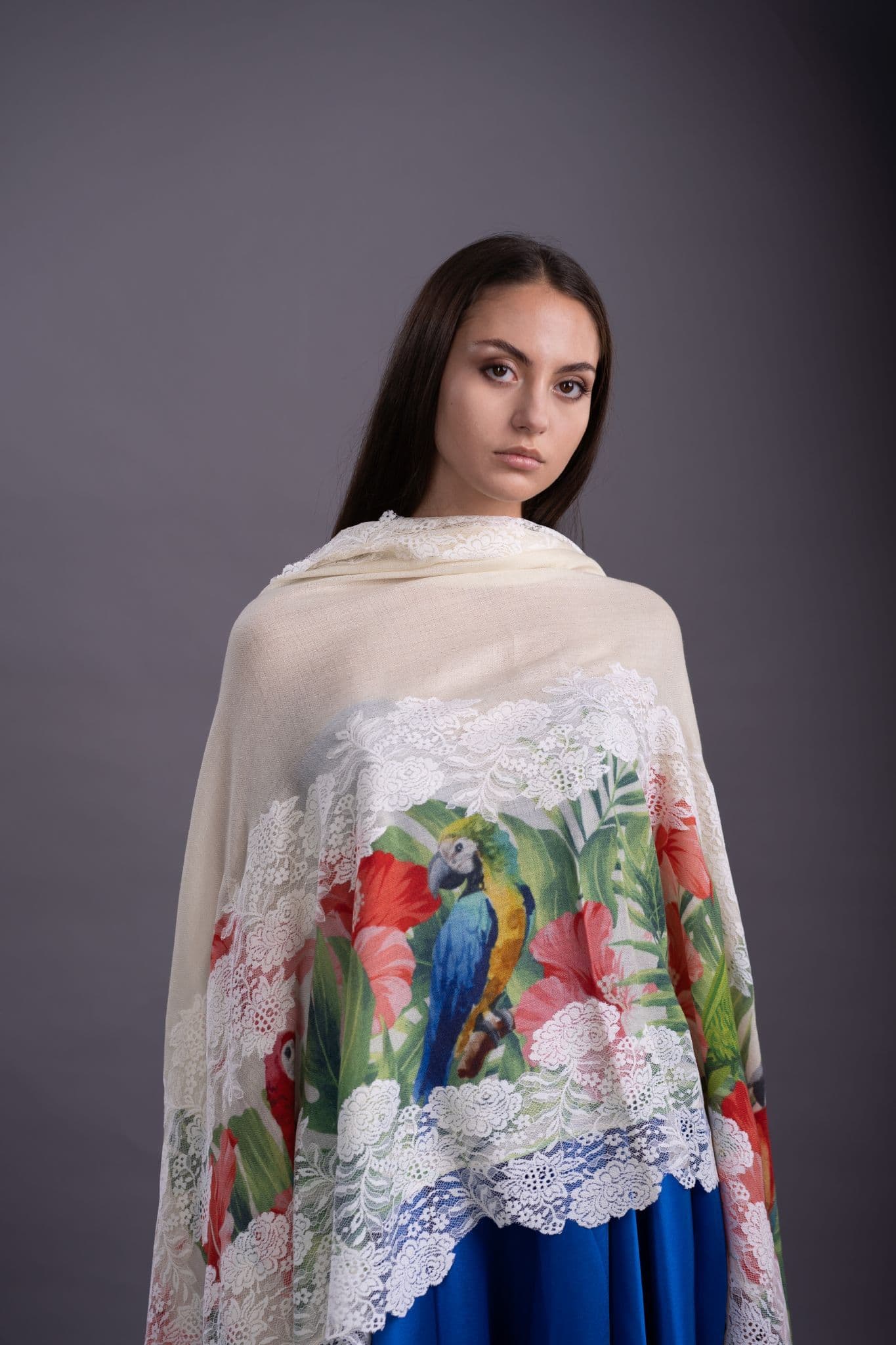This delightful scarf oozes frivolity and a care free attitude, the main feature here has to be the vibrant selection of birds displayed within the scarf. This can be worn effortlessly during the day or night. But be warned this eye catching piece will stop people in their tracks....you have been warned!